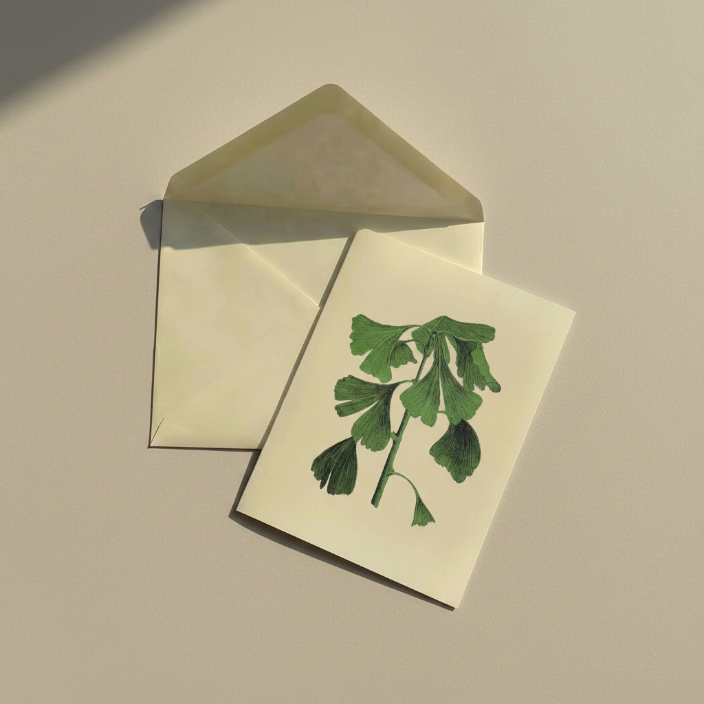 Adapted from a late 19th century botanical encyclopedia, this study captures a new ginkgo branch unfurling. Its structure is architectural yet delicate, the green clear and bright. It marks an auspicious beginning and a growth that arrives right on time.